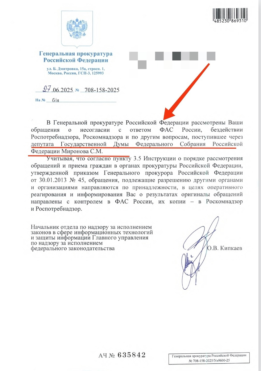 Вместо ответа Генпрокурора, я получил отписку от его подчинённого О.В. Кипкаева от 27.06.2025 №708-158-2025, где: