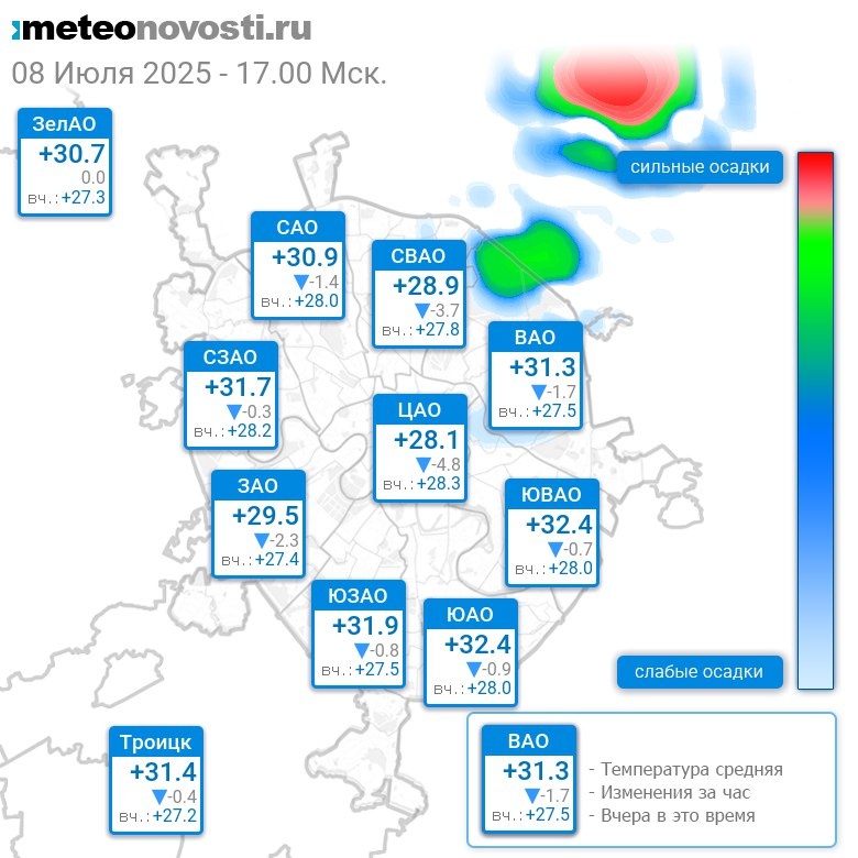 В 17:00 в Москве было от +27.1°C до +33.1°C, средняя температура +30.9°C #погода #Москва #лето #температура #8июля #вторник