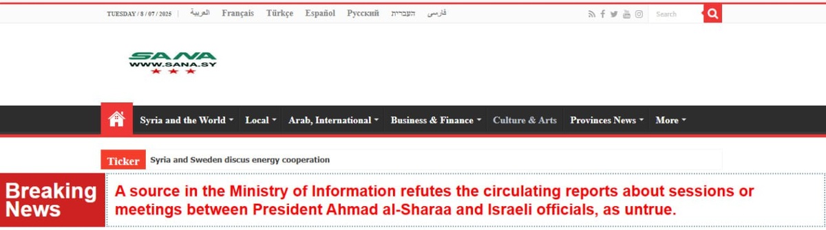 ❗️Syrian Arab News Agency cites Ministry of Information source saying reports of 'Al-Sharaa-Israeli officials meeting UNTRUE