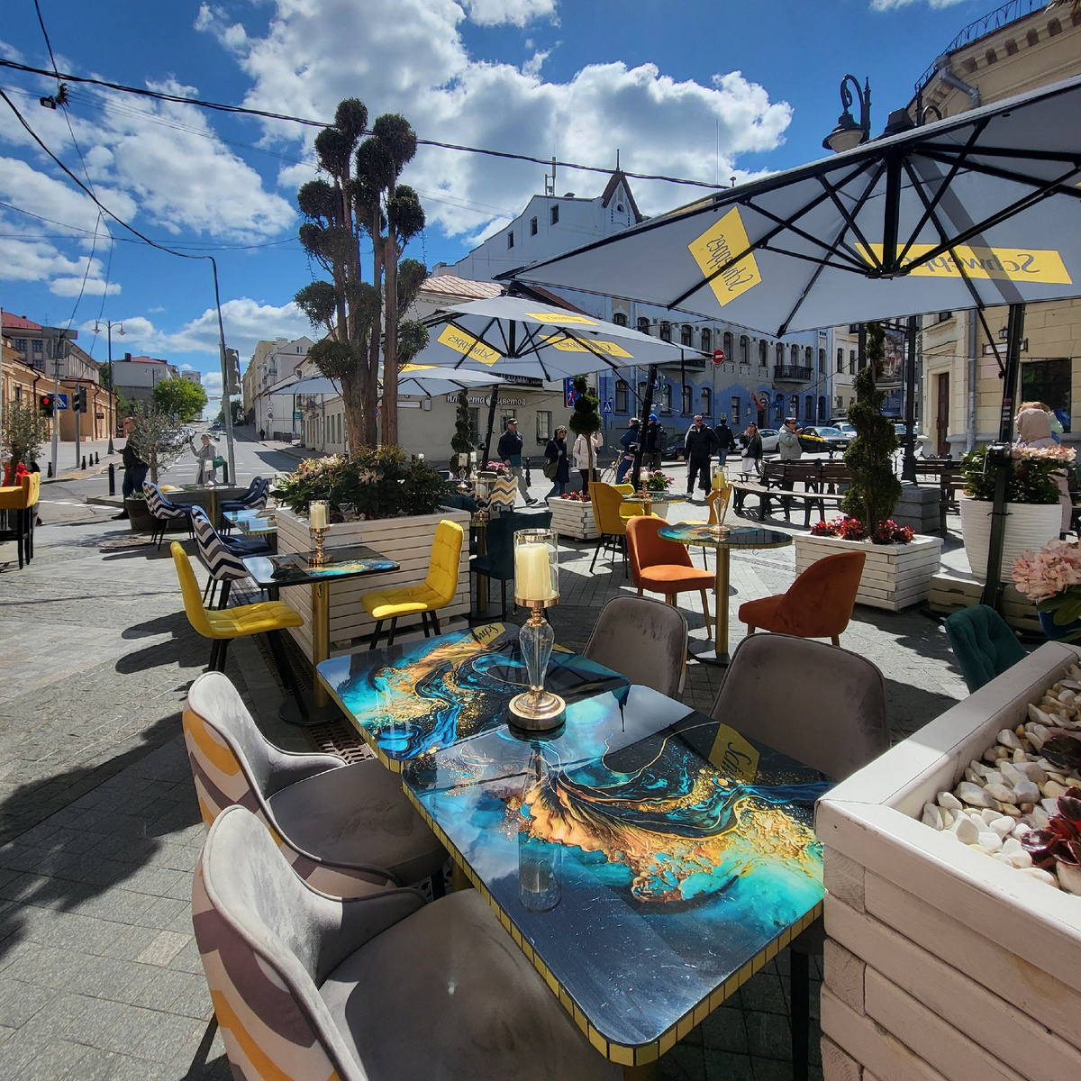 Но самое главное это конечно же интерьер, а точнее мебель, используемая на веранде. В первую очередь это столы с каким-то космическим или морским рисунком и разноцветные стулья в синих, рыжих и серых тонах.