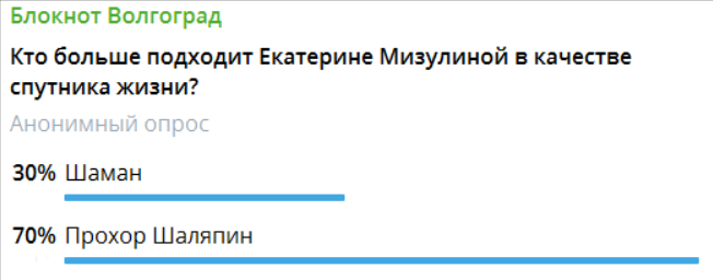 Читатели «Блокнота» считают, что Екатерине Мизулиной стоит рассмотреть другую кандидатуру на место будущего мужа. Общественному деятелю волгоградцы посоветовали приглядеться к голосистому земляку — Шаляпину. Такую позицию местных жителей помог обнародовать наш опрос. Большинство читателей указали на Прохора Шаляпина в качестве ответа на вопрос «кто больше подходит Екатерине Мизулиной в качестве спутника жизни?». Такой вариант выбрали 70% респондентов, Shamana поддержали лишь 30% опрошенных. При этом в голосовании приняли участие более тысячи человек. Как оказалось, поклонниц Шаляпина среди наших читателей гораздо больше, чем фанаток Ярослава Дронова.