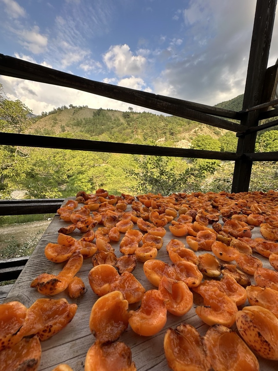 Как получается курага. Берешь абрикос, разламываешь, косточку в ведро, абрикос в раскрытом виде - на досточку. Иногда абрикос такой сладкий, сочный и мягкий, что почти что размазывается по доске, а когда подсыхает, становится самой сладкой курагой. Заканчиваешь одну досточку, несешь на солнце, берешь следующую пустую. Заканчиваются абрикосы - трясешь дерево, они падают, собираешь и повторяешь цикл. С первой каплей дождя выбегаешь и давай заносить доски с абрикосами под крышу, а с последней - обратно на солнце. Так несколько раз в день. Работа хорошо идет под лекции философа Андрея Макарова. Сидишь, разламываешь абрикосы, выкладываешь рядками, смотришь вдаль - там горы, чистый Рерих, глаз радуется, руки заняты, голова свободна. И тут пропадает связь с миром. На тарифе сбой и на вай-фае сбой. Сидишь, вокруг Рерих, тишина, в эфире только птицы, пчелы, мухи, коровы, громы и одна газонокосилка. И мысли начинают течь наискось от привычного генерального потока. И замечаешь, что бабушка рядом