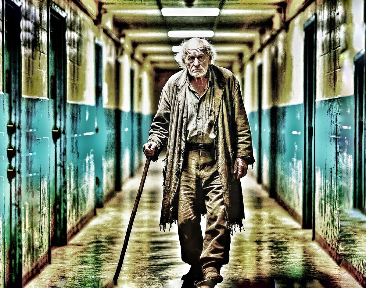 Последним в подвал ввели высокого, древнего на вид старика - неряшливо одетого и опирающегося при ходьбе на клюшку. Сопровождающий охранник торопил его, а старик, сильно хромая на обе ноги, в ответ возмущённо огрызался: как могу, мол, так и иду…