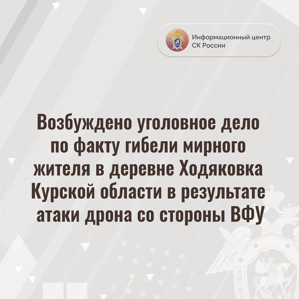 Возбуждено уголовное дело по факту гибели мирного жителя в деревне Ходяковка Курской области в результате атаки дрона со стороны ВФУ