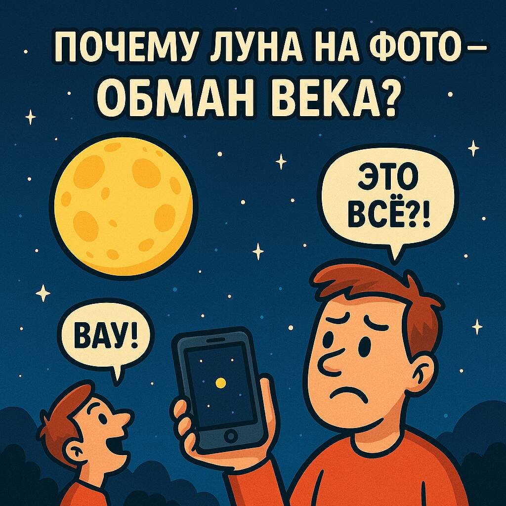 🌍 Почему у нас у всех одна и та же луна, но фотки разные? Привет, земляне (и не только)! Вы когда-нибудь задумывались, почему луна одна, а фотки в инстаграме у всех — как будто с разных планет? У кого-то огромная, как арбуз в гипнозе. У кого-то — как пуговка от куртки. А ведь вроде бы все смотрим в одну и ту же сторону неба. Я вот тоже однажды стою, любуюсь луной, думаю: «Ну всё, сейчас как щёлкну на телефон — будет шедевр!». Щёлкнул… А на фото — унылая точка. Как будто я пытался сфоткать пиксель. И тут я решил разобраться. ⸻ 📸 Почему луна то большая, то маленькая? Ответ — в нашей голове. Ну, и чуть-чуть в атмосфере. Когда луна низко над горизонтом — она кажется больше. Это называется лунная иллюзия. Мозг думает: «О, она рядом с деревьями и домами, значит, большая!» А когда луна высоко в небе — там нет с чем сравнить, и кажется, что она сдулась. Плюс, если у вас ультра-зум на телефоне — можно поймать «кровавую луну с деталями кратеров». А если фотик обычный, то извините, будет «серый