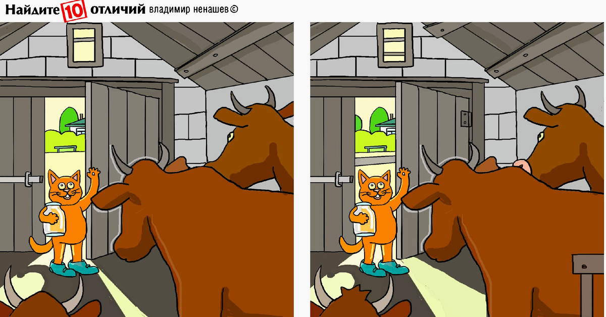 10 отличий. Тест на внимание. Кот, коровы и молоко.