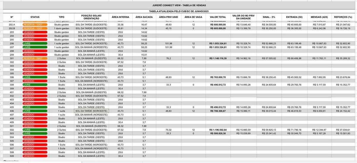 Предложение❗️ Connect View (Jurerê) В прайсе видно, что 💚 - свободных квартир почти не осталось! Я забронировал для нас 301 двушку, самый интересный вариант по нашему мнению 💯 Почему❓ Можно приобрести двушку 301 и разделить на однушку (с парковкой) и студию - под более выгодную сдачу на Airbnb. (Планировка это позволяет) А когда вы решите приехать и сами там пожить, можно будет использовать полную площадь квартиры 🔥 При этом стоимость будет выгоднее на 🇺🇸 22.000 $ чем приобретать отдельно (однушку и студию) 🇧🇷 R$ 1.140.116 | 🇺🇸 210.319 Первоначальный взнос всего 5% ✔️ Полное описание Connect View В этом посте есть большое видео, которое не загрузилось в Дзен. Откройте оригинал поста в телеграме, чтобы его посмотреть