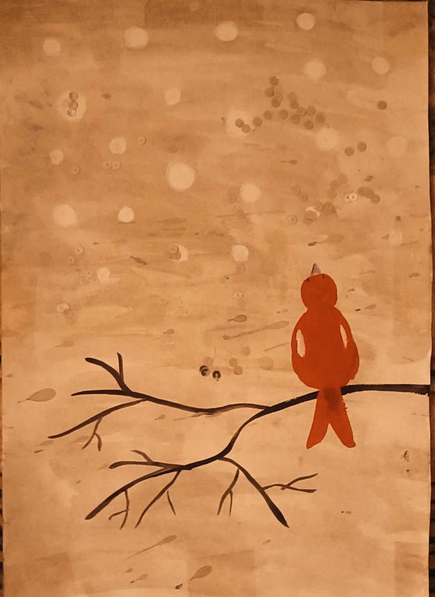 Однажды давным давно в одной деревне жила - была птичка ярко - красного цвета, перья были у нее беленькие маленькие. Звали ее Марфуша . И вот в этой деревне наступила зима. Все птицы улетели на юг, а Марфуша не захотела улетать как обычно, она захотела остаться и посмотреть какая ее деревня зимой. И вот все птицы давно улетели, наступила холодная зима, шел снег, на улице было очень холодно. Марфуша пожалела, что не улетела на теплый юг. "Другим птицам сейчас, наверное, тепло", - рассуждала сама с собой Марфуша. Она жила в маленьком дупле, которое оставила ее подруга сова, которую звали Ева. Как - то раз ранним утром Марфуша решила слетать в ее любимый лес, который был недалеко от ее деревни. И вот она прилетела в лес, там все деревья были в снегу. А все таки не каждая птица увидит такую красоту. "Когда мои друзья прилетят, я им расскажу как красиво в зимнем лесу", - сказала Марфуша, и тут кусты пошевелились, Марфуша испугалась. Показался серый хвост и тут из кустов выпрыгнул волк, Мар