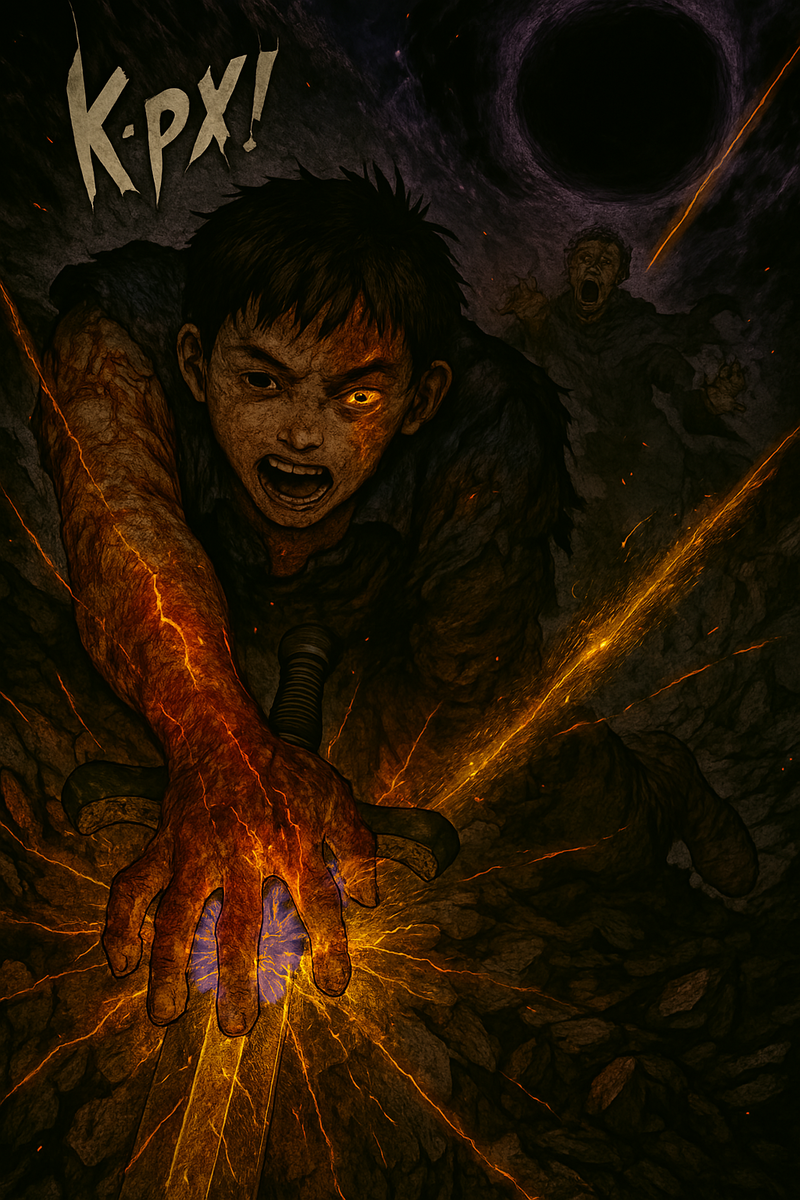 «Я СПАСУ ТЕБЯ! ПРИМИ МЕНЯ! СТАНЕШЬ БОГОМ!» Он ВОНЗИЛ руку в трещину кристалла! Кровь брызнула на Сияющую Сталь. «ПИ! ДАЙ ВСЁ! КАК ТОГДА У РЕКИ! ПОСЛЕДНЮЮ ИСКРУ!» Кристалл ВЗОРВАЛСЯ — но не осколками. Золотое солнце вырвалось из груди Кая! Он стал живым щитом, ловя Черную Нову! Плоть горела, кости трещали, но он не отступал! «Кай... держи... это... я...» — голос Пи рассыпался на искры. Сердце Тени ЗАВИЗЖАЛО. Аннигиляция замедлилась. Торан увидел шанс! Он ВБИЛ посох в землю, выжав последние силы: «РУИНЫ! ПОМНИТЕ СВЕТ!» Стены Синтезиса ожили. Рвы, где лилась кровь, заполнились жидким золотом. Машины, покоренные Тьмой, вспыхнули древними рунами. Земля под Сердцем раскрылась, выбросив лавовый клинок размером с небоскреб! Кай РВАНУЛСЯ вперед, увлекая Черную Нову ЗА СОБОЙ — прямо на магмовый клинок земли