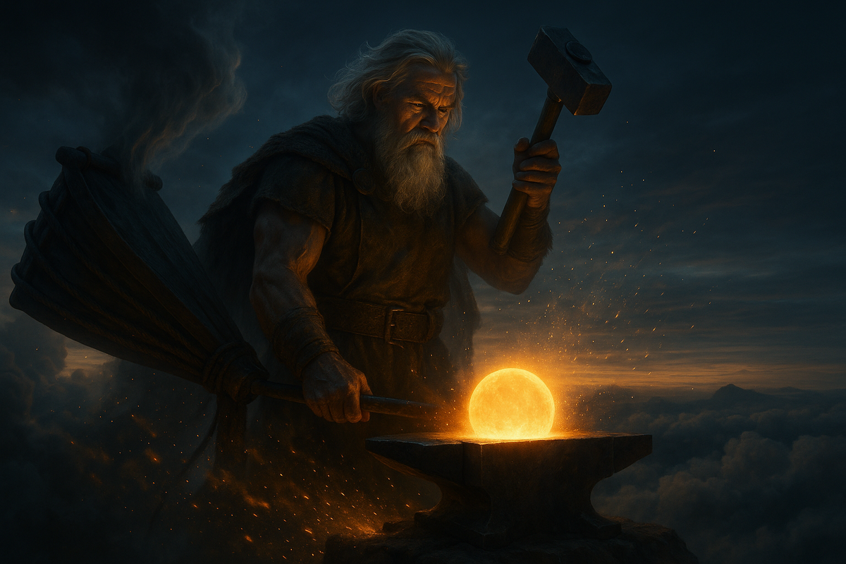 Тогда Сварог замыслил сотворить солнце. Не искру, но пламя; не вспышку, но неиссякающий источник дня. Он собрал рассеянный свет Яви, все золотые отсветы утра и красноватые отблески вечеров, собрал тепло очагов земли и жар молний Перуна. Он спустился в самые корни мира, где спит раскалённое сердце, и вынес оттуда пламя, что рождало камни. Он поднялся выше облаков, выше дыхания гор, туда, где не слышно звуков и где начинается дыхание бездны. Там он возжёг своё небесное горнило и раздувал его огромными мехами мировых ветров. Искры сыпались вниз, и каждая искра могла бы зажечь костёр, но Сварог не хотел множества малых огней — он ковал одно-единственное, великое пламя. Его молот опускался мерно и властно, и каждый удар собирал свет в форму круга, стремясь сделать его ровным и постоянным, чтобы он ходил над миром и никогда не гас. Наковальня звенела под тяжестью его замысла, и звоном этим дрожали облака, вспыхивая крохотными зарницами от соприкосновения со светом великой работы.