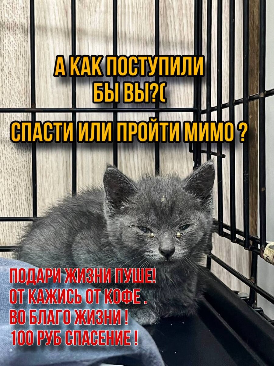Это Пуша - крошечная кошечка, которая осталась совсем одна. нашли её у подвала: без мамы, испуганную и истощённую. Пуша сидела и тихо мяукала, словно звала на помощь. Как пройти мимо ? Как оставить там Уми рать ..?