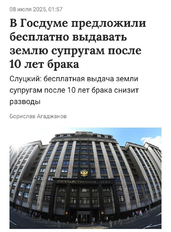 В Госдуме придумали лайфхак для семейников: теперь за 10 лет брака и хотя бы одного ребёнка могут подогнать бесплатный участок земли. Законопроект уже полетел в правительство, осталось только одобрить. Плюс — землю дадут именно в том регионе, где семья живёт. Минус — главное, не разбежаться до круглой даты. Ну что, держимся до юбилея? Подробнее: https://hard-tm.su/threads/100451/ 🕹HARD-TM — Подписаться
