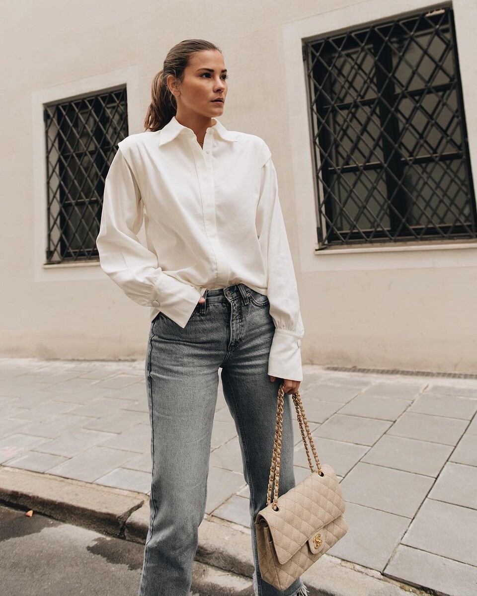 Украшения: Не обязательно массивные. Тонкая цепочка, серьги-гвоздики, браслет-цепочка — уже добавят детали.