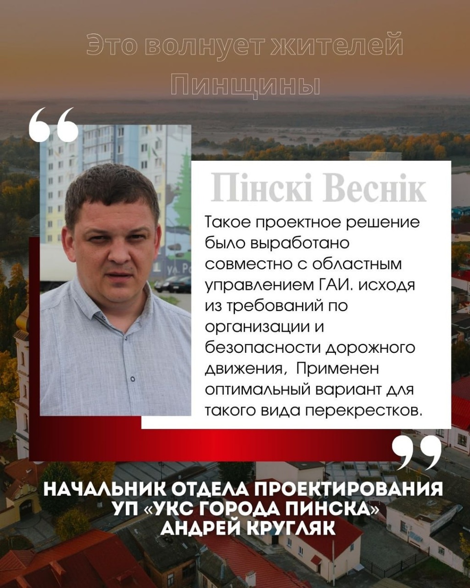 - Такое проектное решение было выработано совместно с областным управлением ГАИ. исходя из требований по организации и безопасности дорожного движения, - дает пояснения начальник отдела проектирования УП «УКС города Пинска» Андрей Кругляк. – Применен оптимальный вариант для такого вида перекрестков. Здесь под разными углами сходятся четыре улицы. На самом кольце предусмотрено пониженное устройство бордюра, который обеспечит возможность следования крупногабаритных транспортных средств. Водителям беспокоиться не стоит. Все технические нормы учтены, остается соблюдать правилам дорожного движения при проезде кольцевого пересечения. @Пинский Вестник ЮТУБ | САЙТ| ИНСТ | ВК | ОК | ФЕ | Прислать новость