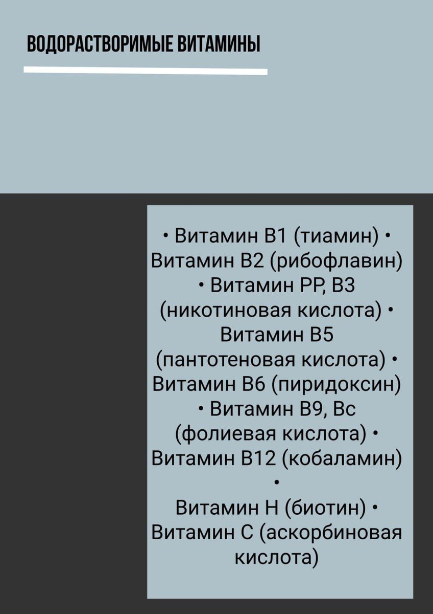Поговорим о важности каждого, заболеваниях связанных, с недостатком или переизбытком таких витаминов, они в отличие от жирорастворимых витаминов не накапливаются, а значит их восстановить несколько тяжелее,