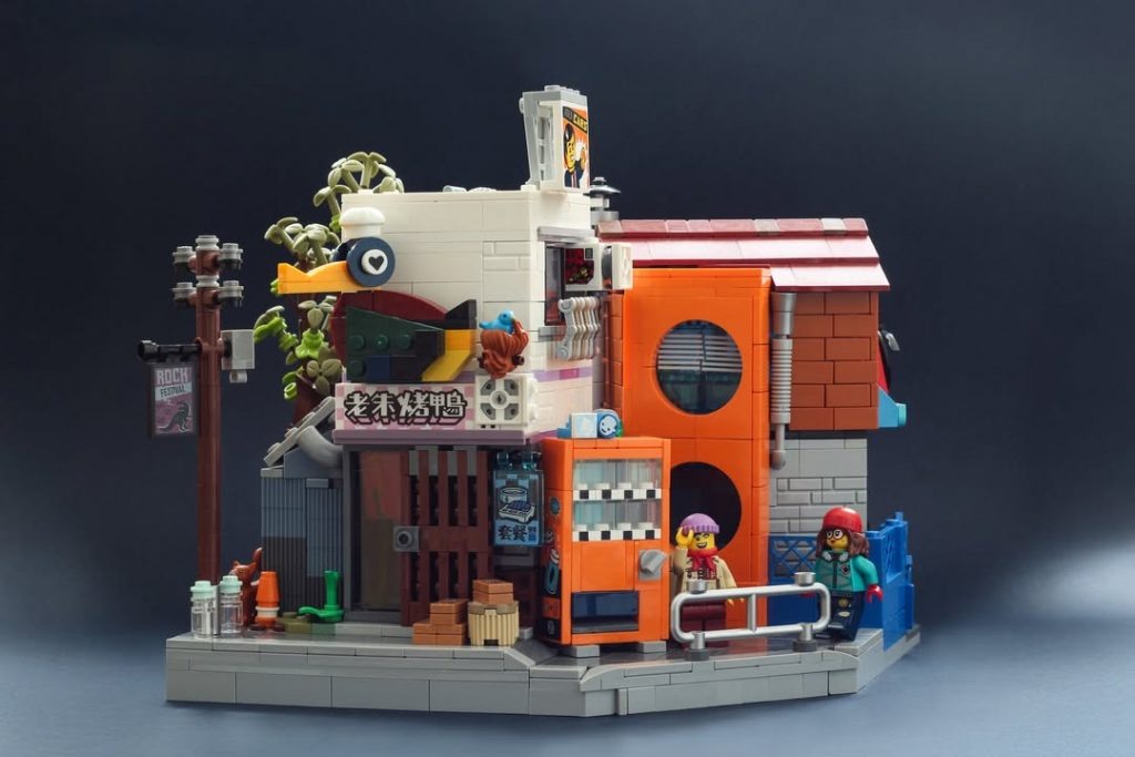 Очаровательный городской квартал от Olle Moquist! Это не просто типичная улица из LEGO — здесь куча деталей, которые хочется разглядывать: бутылки, кошка, строительный конус и даже сорняки, пробивающиеся сквозь плитку. А ещё магазин с уткой на вывеске — возможно, это LEGO Store, а может, и кафе с уткой по-пекински. Так и хочется задержаться здесь подольше!