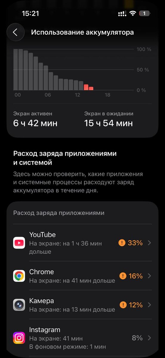 Снял с зарядки в 23:44 и активно пользовался до 07:00 утра, а потом с 13:00. В итоге в 15:51 оставался 1%.