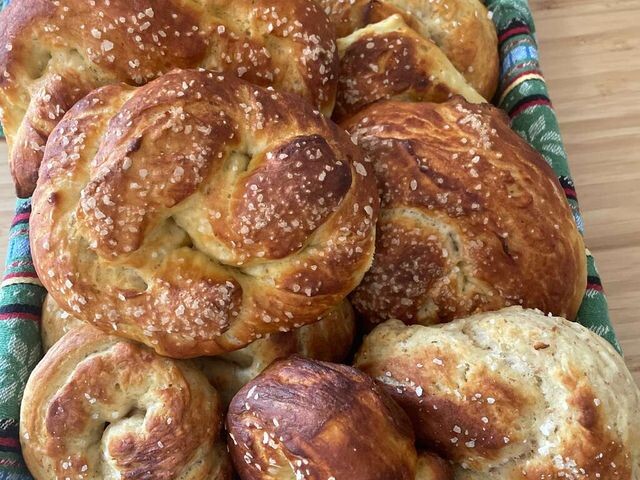 Мягкие крендельки Эти крендельки на вкус совсем как те, что продаются в торговом центре! Подавайте с любимым сырным соусом или горчицей. Спорим, вы не сможете съесть только один! 🍴 Количество: 1 - 2 десятка кренделей Ингредиенты ✅ 1 ⅓ стакана теплой воды (45 градусов C) ✅ 2 столовые ложки маргарина ✅ 1 ½ столовые ложки белого сахара ✅ 0.75 чайной ложки соли ✅ 4 стакана универсальной муки ✅ 2 ½ чайные ложки активных сухих дрожжей ✅ 4 стакана воды ✅ 1 ½ столовые ложки пищевой соды ✅ 2 столовые ложки кошерной соли. Инструкция приготовления 1. В большой миске растворите дрожжи и сахар в теплой воде. Поставить на расстойку на 5 минут. 2. Вмешать масло или маргарин, муку и соль. Разрезать тесто на короткие полоски, скатать в веревочки и придать им форму кренделей. Накройте и оставьте подниматься на смазанном листе для выпечки примерно на 45 минут. 3. В чугунной или другой неалюминиевой кастрюле доведите воду и пищевую соду почти до кипения. Осторожно опустите крендельки в воду п