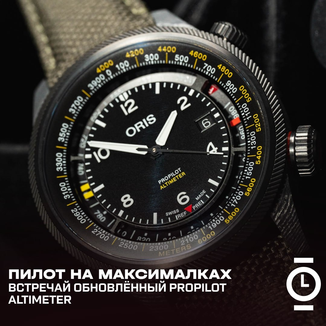 ПИЛОТ НА МАКСИМАЛКАХ: ВСТРЕЧАЙ ОБНОВЛЁННЫЙ PROPILOT ALTIMETER #обзор_WD В 2014 году Oris представила часы Big Crown ProPilot Altimeter — первые механические часы с встроенным альтиметром. В 2023 году модель вернулась в обновлённой версии, представленной на Watches & Wonders, с важными техническими и визуальными доработками. Главная особенность — альтиметр, работающий по принципу анероида. В корпус встроен клапан, создающий «контролируемую утечку» воздуха. Давление внутри выравнивается с внешним, что заставляет специальную мембрану сжиматься или расширяться, перемещая шкалу высоты на внутреннем безеле. Для точных показаний необходима периодическая калибровка с помощью второй заводной головки. Новая модель стала заметно легче — 98 г против 168 г у стальной версии — благодаря корпусу из углеволоконного композита, аналогичного использованному в лимитированной серии Coulson. Толщина уменьшилась до 16 мм. Максимальная высота измерений увеличена на 33% — до 6000 м (19 700 футов). Диаметр