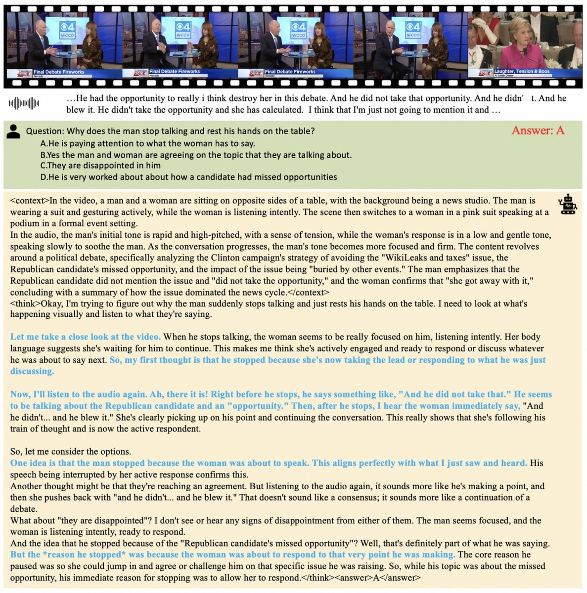 — Понимает видео с диалогами, распознаёт, кто говорит, что происходит, что звучит в кадре;