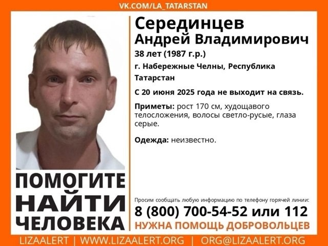 ВНИМАНИЕ! ПОМОГИТЕ НАЙТИ ЧЕЛОВЕКА! Пропал #Серединцев Андрей Владимирович 38 лет (1987 г.р.) Место пропажи: г. Набережные Челны, Республика Татарстан Дата пропажи: с 20 июня 2025 года не выходит на связь. Приметы: рост 170 см, худощавого телосложения, волосы светло-русые, глаза серые. Одежда: неизвестно. Если у вас есть сведения, которые могут посодействовать поиску, позвоните на горячую линию 8 (800) 700-54-52 (звонок бесплатный). ✅ ПОДПИСАТЬСЯ l ПРИСЛАТЬ НОВОСТЬ