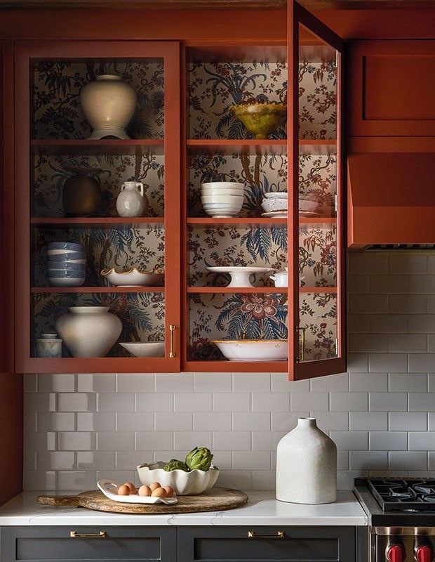 Обои могут стать стильным акцентом в шкафу или буфете, добавив интерьеру индивидуальности и глубины