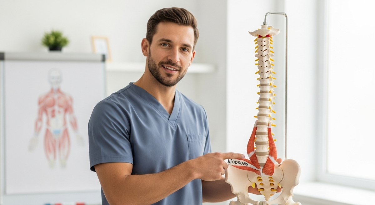 Добрый вечер, дорогие друзья! Сегодня мы с вами научимся быстро и безопасно убирать боль в спине, потратив на это всего 5-10 минут в домашних условиях. Это будет особенно полезно тем, кому тяжело разогнуться после долгого сидения, и тем, кто постоянно чувствует ноющую боль в пояснице. Зачастую корень проблемы кроется в одной очень важной, но малоизвестной мышце — подвздошно-поясничной. Представьте себе, она идёт от поясничных позвонков, проходит через таз и крепится к бедренной кости. Когда эта глубокая мышца спазмируется или ослабевает, она тянет за собой поясницу, вызывая боль, которая может отдавать даже в тазобедренный сустав. Самое неприятное, что эту мышцу почти невозможно нащупать и промассировать самостоятельно. Но есть отличная новость! Мы можем на неё эффективно воздействовать с помощью простых упражнений, про которые я вам сегодня расскажу. Для этих упражнений нам понадобится только удобная поверхность — диван, кровать или коврик на полу. Начнём с самых простых вариантов. Эт