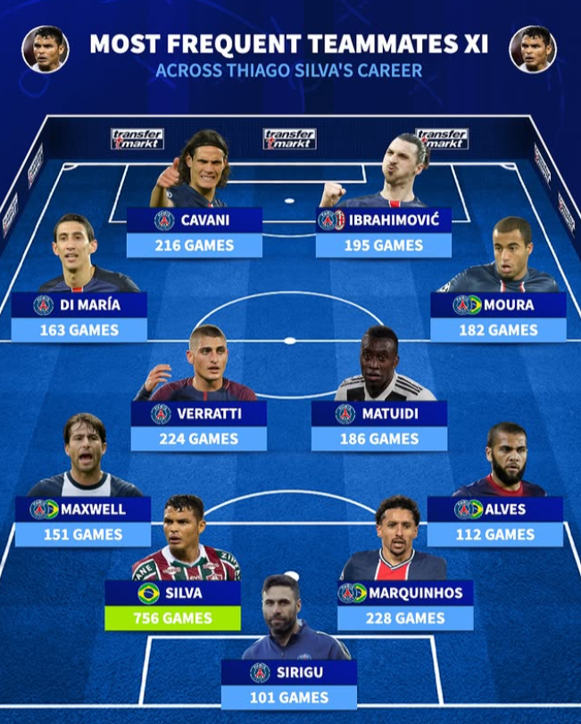 Тиаго Силва в 40 лет сыграет в 1/2 КЧМ. Бразилец успел поиграть за три из четырех полуфиналистов турнира – «ПСЖ», «Челси» и его нынешний клуб «Флуминенсе», он не заглядывал только в «Мадрид». Пожалуй, поклонники всех трех команд могут назвать бразильца клубной легендой. Портал Transfermarkt решил составить команду из футболистов, с которыми Силва чаще всего делил поле. Со всеми игроками, попавшими в символический состав, защитник выступал за «ПСЖ». Главным товарищем по команде Тиаго оказался Маркиньос – у них 228 совместных матчей за парижан и сборную Бразилии, они провели на поле вместе 17 260 минут. Совсем немного отстал Марко Верратти, у них с Силвой 224 матча за «ПСЖ» – это 15 480 минут. Третью строчку занял еще один партнер защитника по клубу из столицы Франции: Эдинсон Кавани, который провел с бразильцем 216 игр или 16 015 минут В команду также вошли: Златан Ибрагимович, Анхель Ди Мария, Лукас Моура, Блез Матюиди, Максвелл, Дани Алвес и Сальваторе Сиригу. Команда одноклубников Ти