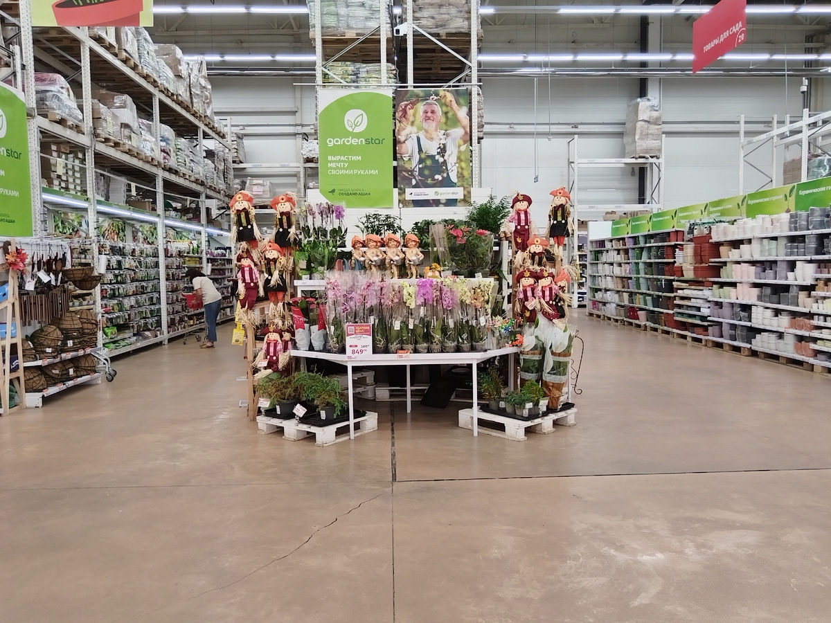 Покупателей в грустном цветочном отделе Ашана нет. Меня же в такие отделы заводит спортивный интерес: что продают и по какой цене. В отделе четыре ряда стеллажей и островок с комнатными цветами. Один стеллаж с пластиковыми горшками разного цвета и размера. Предложения удовлетворят разнообразные запросы. Напротив горшков расположен садово-огородный инвентарь: перчатки и мешки, лоточки и совочки, завязки и подвязки, распылители и лейки, шланги и насадки и многое другое. За инвентарем стеллаж с грунтом разного состава и объема. Напротив грунта нераспроданные семена этого сезона. Сезон им уже прошел, но яркие пакетики по сей день украшают цветочный отдел. А вот ассортимент цветов очень и очень скромный. Я бы даже сказала грустный. Центральное место на островке занимают цветущие орхидеи. Продаются они сейчас по красным ценникам. С обратной стороны островка собраны растения, которые расставлены как-то не совсем привлекательно. В отделе сейчас много растений по красным ценникам. Но ничего н