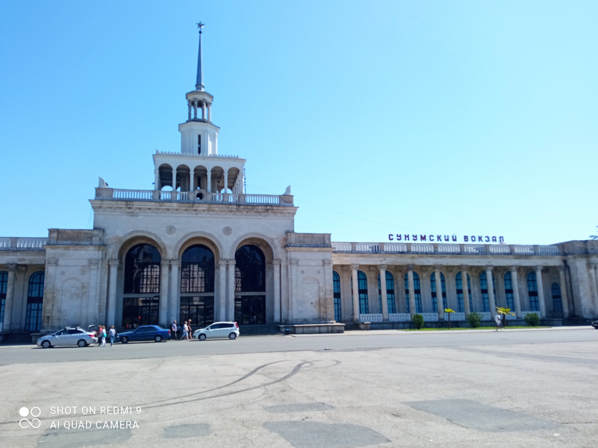 Здание вокзала не удалось сфотографировать, так как не разрешили вставать с места. Здесь был пограничный контроль с абхазской стороны. Пограничники смотрели только фамилию в паспорте. Больше ничего не проверяли.