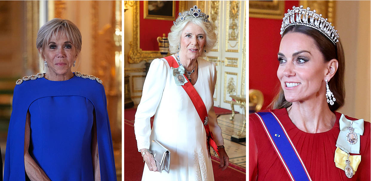 Первая леди Франции, королева Великобритании и принцесса Уэльская вполне могли составить французский флаг, если бы сфотографировались в таком порядке: Однако из дам - высоких гостий государственного банкета королевского ранга в честь визита в Великобританию президента Франции Эммануэля Макрона, который дал король Карл III в Георгиевском зале Виндзорского замка, лишь Кэтрин, принцесса Уэльская, и первая леди Франции Брижит Макрон выбрали цветные наряды. Остальные были в белом. Королева Камилла, в белом платье от Фионы Клэр, тиара - Бельгийская сапфировая, из коллекции королевы Елизаветы II, сапфировый комплект короля Георга VI, орден Почетного легиона, звезда ордена Подвязки и Королевский семейный орден короля Карла III. Принцесса Уэльская, в красном шелковом платье с кейпом и складками, созданном Сарой Бертон для Givenchy. Тиара - "Узелки любви", серьги Гревилл, клатч с вышивкой - ландышами. Она также продемонстрировала Розетку Великого офицера Национального ордена "За заслуги" и