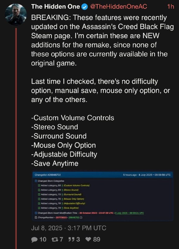 Ubisoft снова выдала флекс: на странице Assassin’s Creed IV: Black Flag в Steam внезапно появились фишки, которых в игре сроду не было! Теперь там светятся такие опции: 🟠Пользовательские ползунки громкости; 🟠Стерео- и объёмный звук; 🟠Возможность задротить одной мышкой; 🟠Регулируемая сложность; 🟠Сохранения в любой момент. Пахнет либо изрядной дезой, либо грядущим ремейком. Следим за обновлениями и запасаемся попкорном! Подробнее: https://hard-tm.su/threads/100613/ 🕹HARD-TM — Подписаться