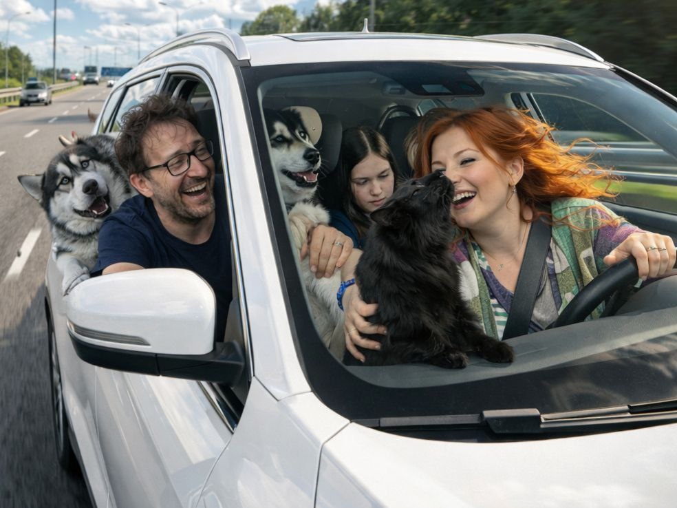 Черника, самая бойкая из близняшек - хаски, устроила на заднем сиденье квест по добыче печенья из сумки Аленки.