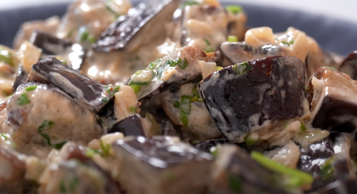 1. Возьмем два баклажана общим весом около 750 граммов и нарежем их кубиками. 2. Добавьте чайную ложку соли и хорошо перемешайте. 3. Добавить смесь молотого перца. 4. Удалите жидкость, которая выделилась из баклажанов. 5. В баклажаны добавляем одно яйцо, взбитое вилкой, и тщательно перемешиваем. Оставляем их на 10-15 минут, периодически перемешивая. 6. Тем временем нарежем одну луковицу и два зубчика чеснока. 7. Возьмите зелень: кинзу, укроп или петрушку — что предпочитаете. Мелко нарежьте ее. 8. Нагреем масло и обжарим лук до золотистого цвета. 9. Выложим его на тарелку, оставив масло на сковороде. 10. Снова разогреем масло и обжарим баклажаны до готовности, периодически переворачивая. 11. Баклажаны дополним обжаренным луком, чесноком и зеленью. 12. Добавим 200 граммов жирной сметаны. Тщательно смешаем и подержим на огне ещё 1–2 минуты.. Баклажаны — это вкусное и полезное блюдо. Они могут заменить мясо и прекрасно сочетаются с разными гарнирами: картофельным