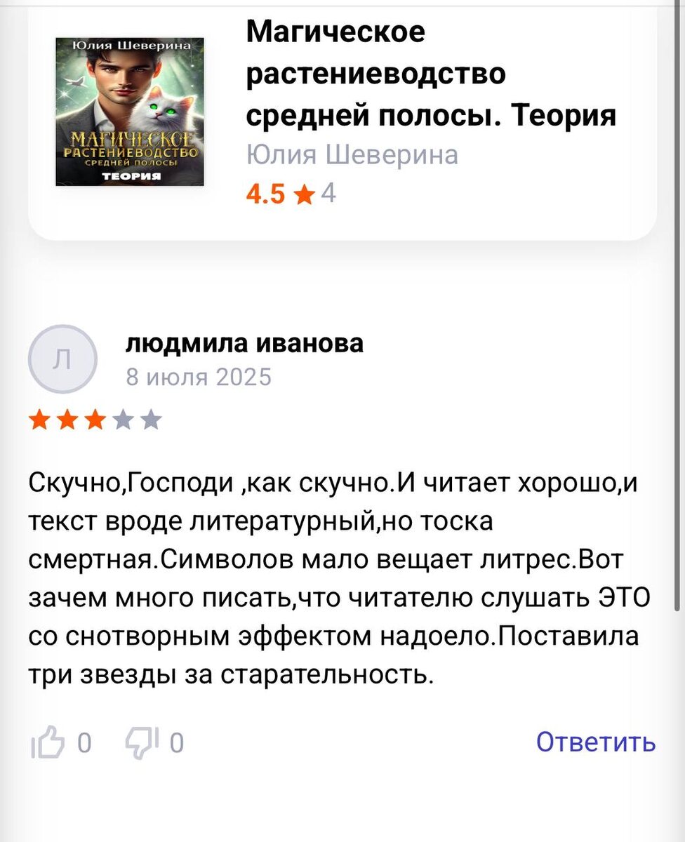 Радует, что хоть текст читательница оценила как литературный 😒 но я всё равно рада, что у книги появился «человеческое» аудио, автоматические мне совсем не нравятся :( А вы слушали? Неужели и правда клонит в сон?? https://www.litres.ru/audiobook/uliya-sheverina/magicheskoe-rastenievodstvo-sredney-polosy-teoriya-71637277/
