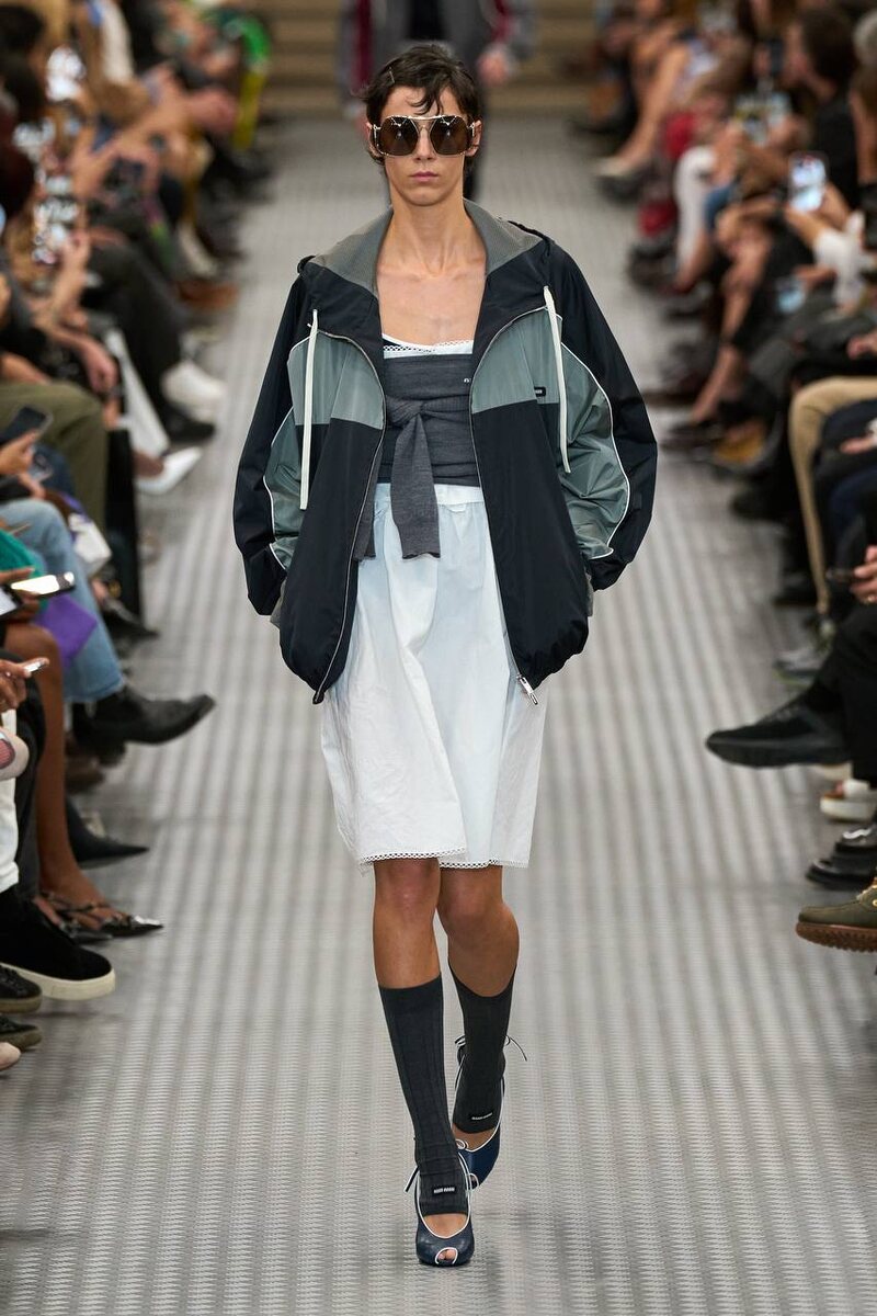 Олимпийка незаметно самой модной курткой лета (вот так сменилась парадигма). Или анорак. Отличаются они, сути, только молнией (во всю длину на олимпийке и короткая - у анорака). Традиционно скажем спасибо Miu Miu (хотя олимпийки выпустили многие бренды) В этом сезоне олимпийки шьют из шелка и полупрозрачных тканей и носят с игривыми юбками. Где искать: Sanchy
