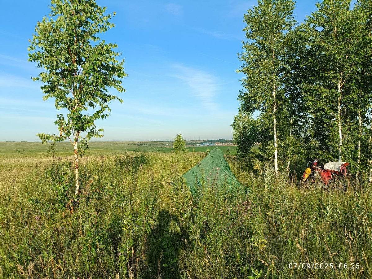 Утренние фото с места ночёвки. Остановился на пригорке в степи. Ещё вчера на трассе встретил велотуриста Данилу, ведущего ютуб Канал https://youtube.com/@danil.kashapov?si=FRlCj3awQj6P4QLy. Как это часто бывает, забыли селфи сделать)). Он возвращался в Екатеринбург из монголии В этом посте есть большое видео, которое не загрузилось в Дзен. Откройте оригинал поста в телеграме, чтобы его посмотреть