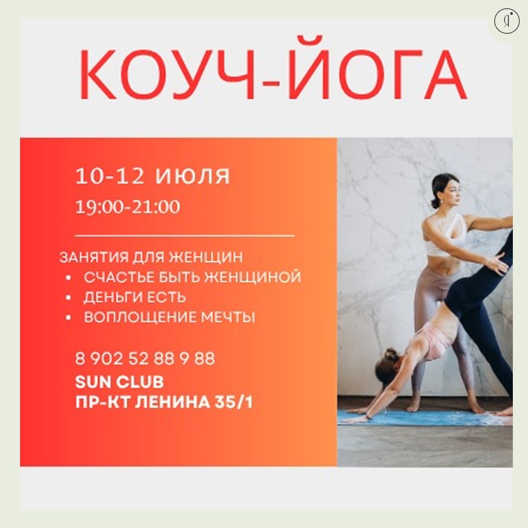 Коуч-йога #МК 🪷 10 июля в 19:00 Комплекс КОУЧ-йоги "Счастье быть Женщиной" 🪷 11 июля в 19:00 Комплекс КОУЧ-йоги "Деньги есть" 🪷 12 июля в 19:00 Комплекс КОУЧ-йоги "Воплощение мечты" Занятия подходят для женщин любого возраста с любым уровнем физической подготовки Нужно : 🤩 одежду, удобную для движений 🤩 сменную обувь (тапки или сланцы, чтобы дойти из раздевалки в зал) 🤩 водичку 🤩 коврик для йоги и плед для релаксации (если нет коврика, то дадим) 🤩 Sun club, Ленина 35/1 1000 руб. / одно занятие 1500 руб. / два занятия 2500 руб. / три занятия +79025288988 Online Якутия | Подписаться