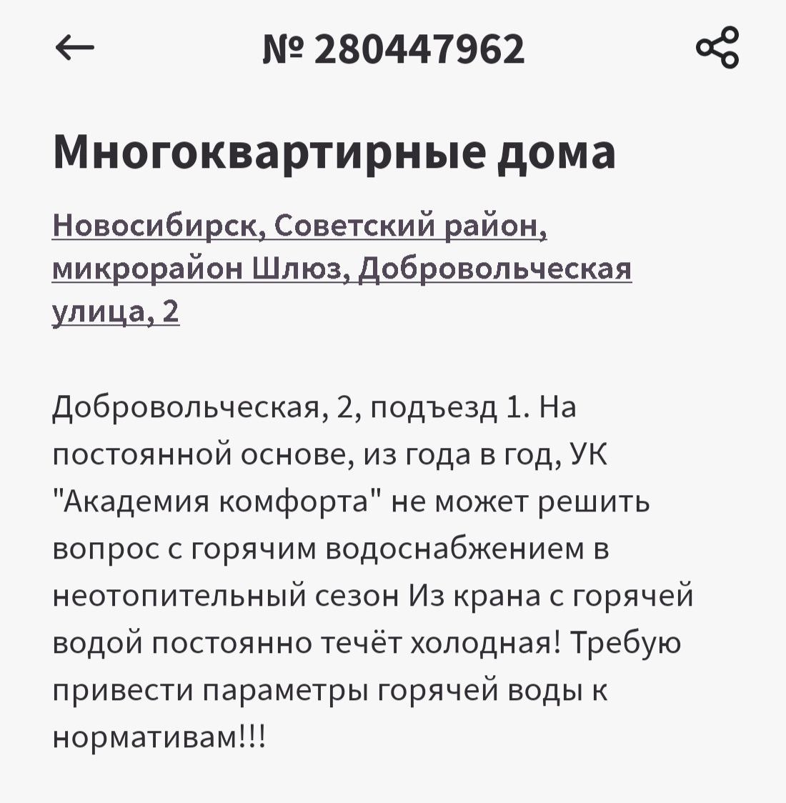"ЧУДЕСНЫЙ" ОТВЕТ! Много разных ответов получал я на свои обращения через "Госуслуги. Решаем вместе", но ответ, полученный от районной администрации в рейтинге абсурдности явно выделяется. Вопрос: "Добровольческая, 2, подъезд 1. Многие годы из крана с горячей водой течёт холодная вода. УК "Академия Комфорта" не может решить вопрос. Требую привести параметры горячей воды к нормативам! " Ответ: "По информации от ФГУП "УЭВ" с 7 по 12 июля будет прекращена подача горячей воды всем потребителям. С уважением, администрация Советского района". Вопрос к ЦУР Новосибирской области, мэрии Новосибирска, администрации Советского района г. Новосибирска и лично её главе г-ну Оленникову Д. М. - этот ответ - он, точно, с уважением?