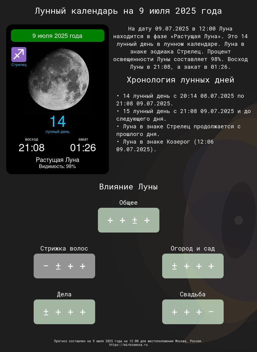 Лунные календари на 9 июля 2025 года: Подготовьтесь к этому дню с учетом влияния Луны! 🔹🌗 Лунный календарь на 9 июля 2025 года — Что приготовила Луна? Подробнее 🔹✂️ Лунный календарь стрижек на 9 июля 2025 года — Подходящий ли день для обновления прически? Подробнее 🔹🌱 Лунный календарь огородника и садовода на 9 июля 2025 года — Лучшее время для ухода за растениями. Подробнее 🔹📅 Лунный календарь дел на 9 июля 2025 года — Удачные моменты для важных задач. Подробнее 🔹💍 Лунный календарь свадеб на 9 июля 2025 года — Подходит ли этот день для вашего торжества? Подробнее