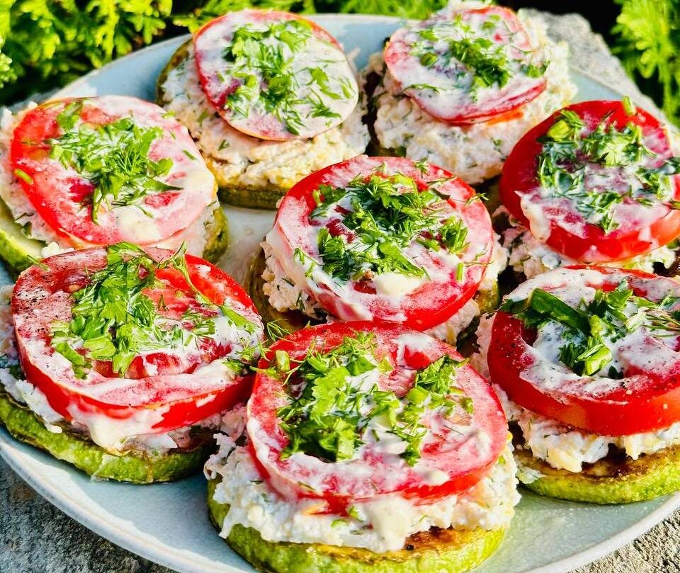 сыр – 70 г. Способ приготовления: Кружки кабачка выложить на доску. Посолить по вкусу. Посыпать перцем и сухим чесноком. Обвалять каждый кружок в муке. В сковороде разогреть растительное масло, выложить кабачки, обжарить до золотистого цвета. Перевернуть и обжарить с другой стороны. Кружки томата посолить, поперчить по вкусу Смазать небольшим количеством майонеза. Зелень измельчить, большую часть отложить, оставшейся посыпать помидоры. Творог положить в миску. Сыр натереть на мелкой терке, положить в миску. Чеснок измельчить, положить в миску. Всыпать зелень. Влить майонез. И все как следует перемешать в однородную массу. Кабачки перело