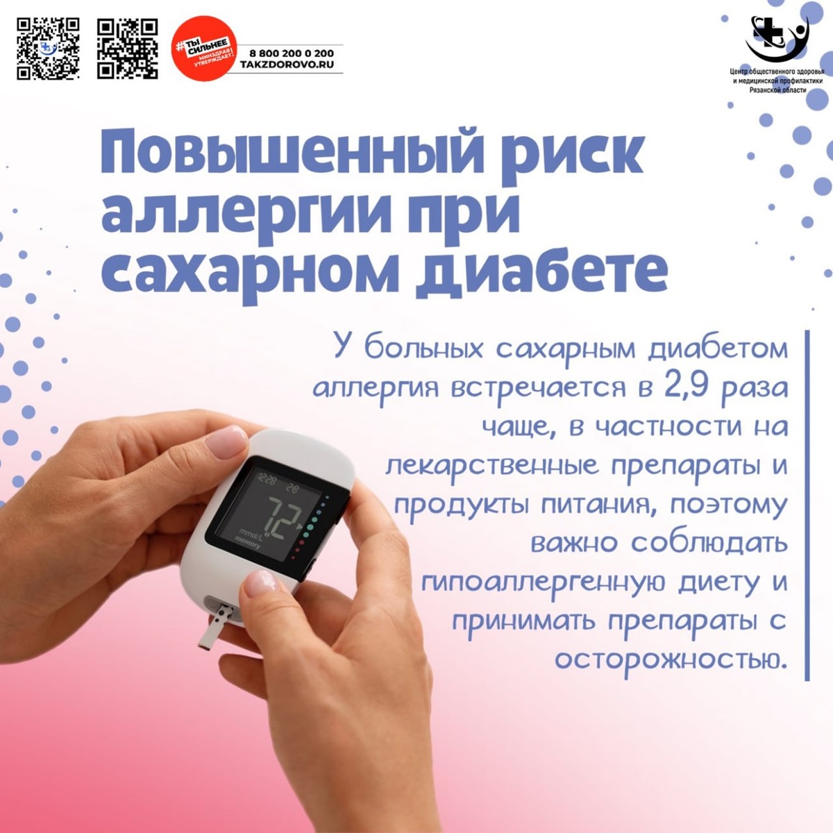 Идёт неделя профилактики аллергических заболеваний! Важно знать: у людей с сахарным диабетом риск аллергических реакций повышен! Почему? 🔹 Нарушения обмена веществ могут влиять на иммунную систему 🔹 Частый приём лекарств повышает вероятность лекарственной аллергии 🔹 Диабетическая нейропатия может маскировать симптомы аллергии Что делать? ✔ Особо тщательно избегать контакта с известными аллергенами ✔ Все новые лекарства принимать только после консультации с врачом ✔ Регулярно проверять кожные покровы (при диабете замедлено заживление) ✔ Под рукой всегда должны быть антигистаминные препараты (одобренные эндокринологом) Важно! При диабете аллергические реакции могут протекать тяжелее и требовать особого подхода в лечении. Не игнорируйте тревожные симптомы! Консультируйтесь со специалистами - аллергологом и эндокринологом. #Аллергия #Диабет #Профилактика #Здоровье #Здоровоебудущее #Здоровоебудущее62 #ЗдороваяРязань