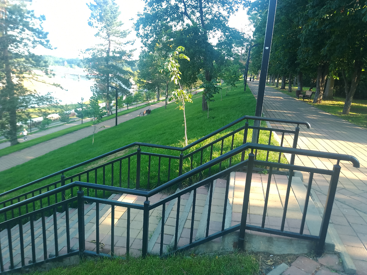 Майкопская ГЭС введена в эксплуатацию в декабре 1950 года, сейчас работает как резервный источник электроэнергии, в пиковые часы нагрузок. Плотина построена по деривационной схеме: от основного русла реки вода отводится в отдельный канал, на котором установлена ГЭС. Вода через плотину протекает вхолостую, а энергия вырабатывается на канале, который через 2 км втекает обратно в реку. Видны камни на русле реки... Тут же на набережной современный ЖК. Тут набережная кончается. Пойду в другую сторону, настроение замечательное!