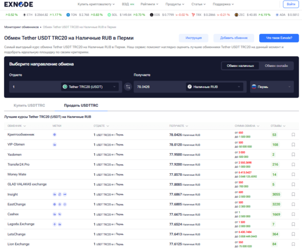 Сервис мониторинга Exnode помогает жителям Перми находить проверенные обменные пункты, анализировать их репутацию и выбирать оптимальные условия для операций с Bitcoin, USDT и другими цифровыми активами.