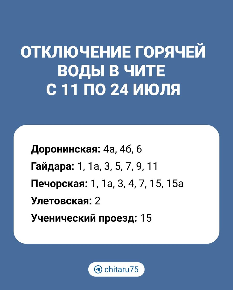 19 домов в Чите останутся без горячей воды в Чите с 11 по 24 июля включительно.