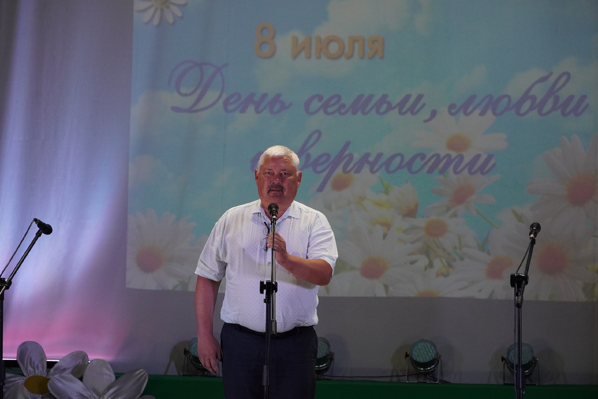 Ведущие программы Наталья Бегунцова и Елена Гайдар предоставили слово заместителю главы района по общественно-политической работе Юрию Гончарику: — День семьи, любви и верности, конечно же, это праздник наш, российский, православный, — сказал он. – Семья – это сохранение и укрепление традиций, создание новых семейных праздников. И каждая семья ценна по-своему. Юрий Сергеевич вручил семье Сонич – Александру Ивановичу и Светлане Александровне медаль «За любовь и верность» и грамоту. Им также подарили ромашковый букет – символ любви и верности. Ещё один букет ромашек нашёл своих героев, супругов Чекмарёвых Павла Фёдоровича и Валентину Владимировну, отмечающих в этом году 55-летний юбилей совместной жизни. Под руководством ведущих праздника все зрители разделились на две команды – семьи Ромашковых и Васильковых и дружно отвечали на вопросы викторины о семье, детях, родне. Хорошее настроение присутствующим в зрительном зале дарили участники художественной самодеятельности – солисты, дуэты,