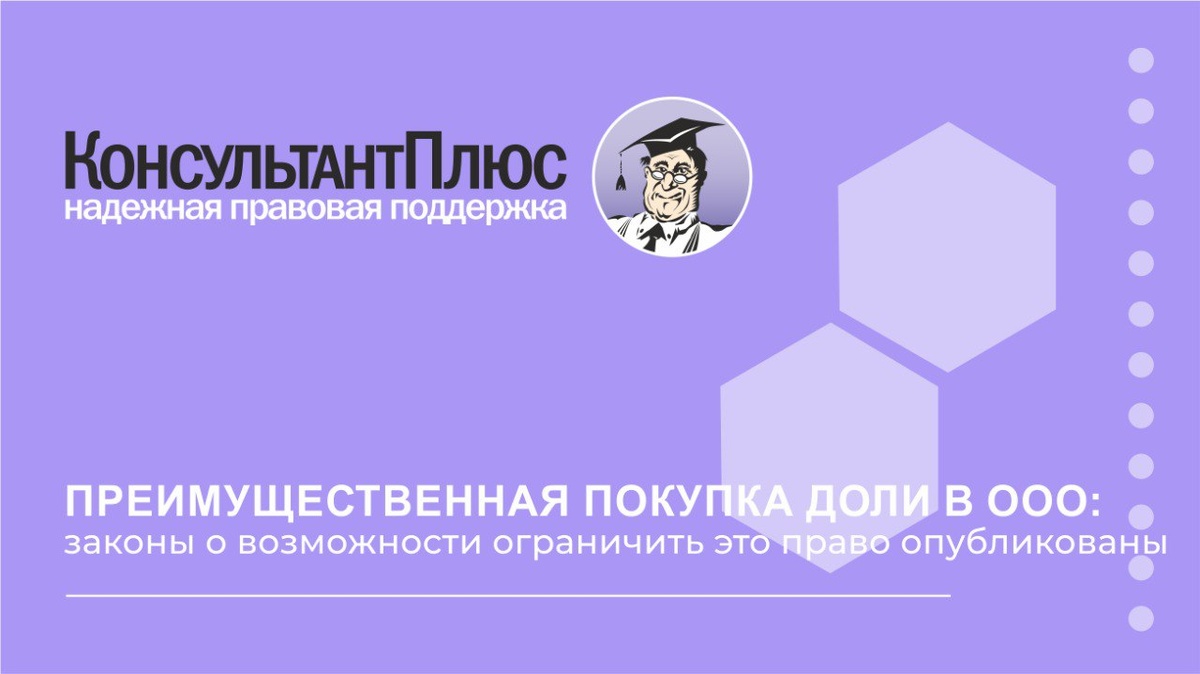 🆕 С 1 сентября 2025 года в Законе об ООО появится возможность предусмотреть в уставе, что для отдельных или всех участников реализация преимущественного права покупки доли либо ее части зависит от определенных обстоятельств, срока или их сочетания. Иной вариант – запретить использовать это право: - всем участникам; - 1 или нескольким лицам, которые прямо названы в уставе; - тем, кто, например, владеет долей определенного размера. Данные положения разрешат включить в устав при учреждении ООО или позже. Сейчас в Законе об ООО нет нормы, которая разрешает отменить право преимущественной покупки. Изменение вступит в силу 18 июля 2025 года. Есть и другие новшества. 📄 Документы: Федеральный закон от 07.07.2025 N 186-ФЗ Федеральный закон от 07.07.2025 N 185-ФЗ #консультантплюс #юристу #руководителю #правопокупки #преимущественноеправо