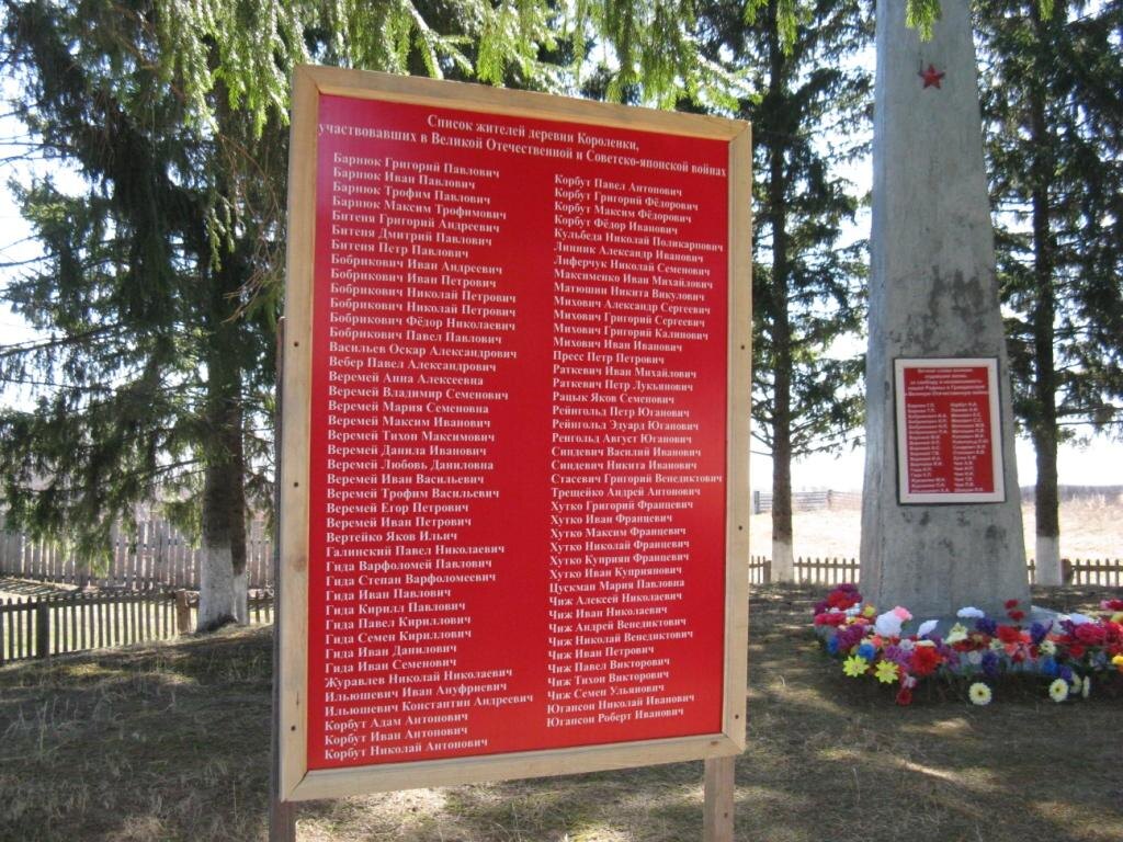 Примечательно, что кроме короленцев – участников Гражданской войны, на обелиске увековечены шесть фамилий участников Великой Отечественной войны – уроженцев других деревень, родственники которых в послевоенный период стали жителями Короленки. Это Журавлев М.Н., Журавлев П.Н., Матюшин М.В., Матюшин П.В., Раткевич Н.И. и Шевцов П.Н. И здесь короленцы проявили мудрость и не стали делить людей на «своих» и «чужих». Да и где было увековечивать память этих людей, если давно нет уже тех деревень, в которых они родились и из которых ушли защищать Родину.