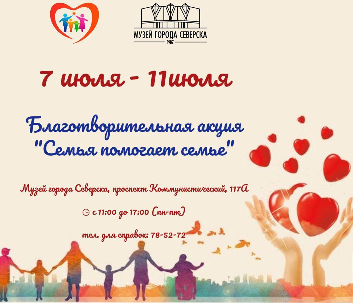 Неделя добра в музее ко Дню семьи, любви и верности С 7 по 11 июля музей города Северска совместно с детско-юношеской общественной организацией «Лоза» проводит благотворительную акцию "Неделя добра". В рамках акции объявлен сбор вещей, книг и полезных мелочей, которые могут стать нужными и радостными для других семей. Что можно принести: - чистую, аккуратную одежду и обувь (для детей и взрослых) - книги для детей, подростков и взрослых - настольные игры, игрушки в хорошем состоянии - комнатные растения, рассада, семена — для тех, кто любит зелёный уют - школьные принадлежности, канцелярия - текстиль: пледы, скатерти, полотенца (новые или чистые и опрятные) - товары для творчества Приём вещей: Музей города Северска, проспект Коммунистический, 117А с 11:00 до 17:00 (пн-пт). По всем вопросам можно обратиться по телефону: 78-52-72.