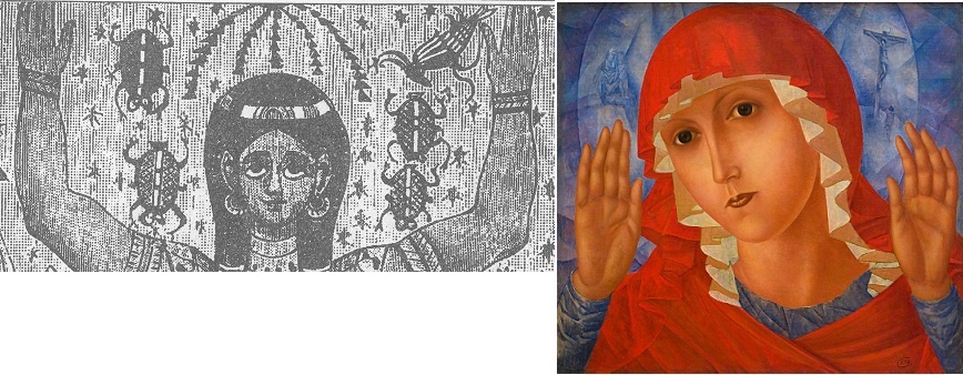 «Оранта (лат. Orans — Молящая) — богородица с поднятыми раскинутыми руками ладонями наружу. Оранта восходит к искусству Др.Египта и Месопотамии, изображениям человека с поднятыми руками, символу молящей души. В античном искусстве – адорант (лат. adoratio — обожание, поклонение) – символ верности и благочестия, в заупокойном культе — мольба о прощении и ниспослании дара небес».